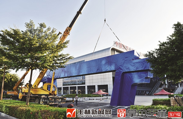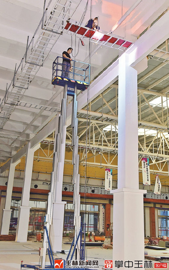 在中国—东盟小商品交易中心门前广场,记者看到两辆大型吊车正在吊装蓝色的玉博会主题大门,进入小商品博览中心三楼展馆,装修施工现场一片火热,工人正进行展馆内立面装修、内部线路和中央空调安装等工作。