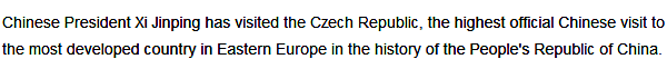 习主席对捷克的访问不仅对中捷关系产生深远的历史影响,还将进一步巩固和提升双边关系。双方目前已共同宣布建立战略伙伴关系。(编译: 李珅)