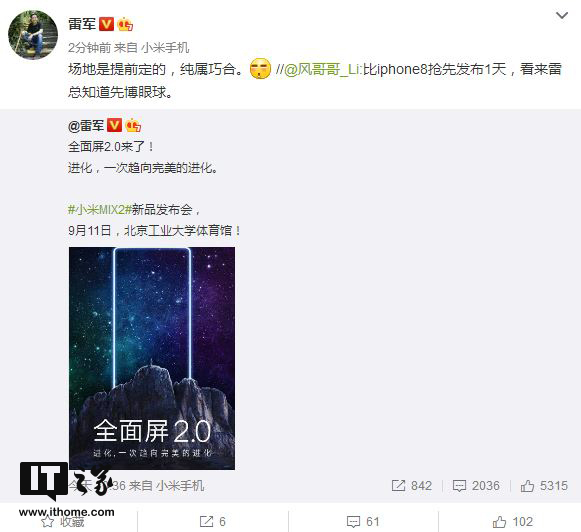 不过真有好事者在微博上询问雷军,“比iPhone8抢先发布1天,看来雷总知道先博眼球。”,而雷军随后也将该评论转发出来,特别表示:“场地是提前定的,纯属巧合。”还配了一个“汗”的表情。