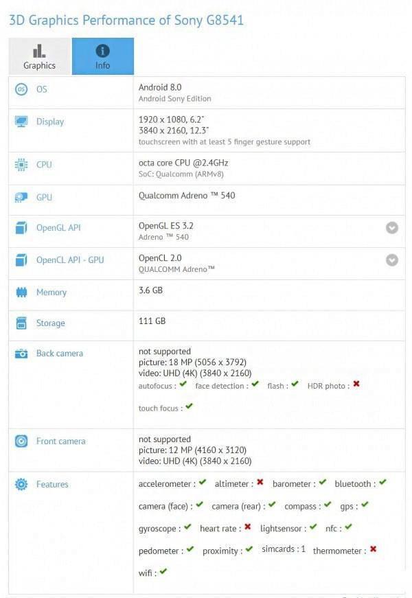 在GFXBench上,这款名为“G8541”的设备共有两个尺寸,一个为6.2寸1080P屏幕,一个为12.3寸4K屏幕,看上去是一款巨屏手机和一款安卓平板,根据日本媒体的爆料,这款新手机可能就是索尼Xperia XZ1 Ultra,定位为巨屏旗舰,除了6.2寸的屏幕外,还搭载高通骁龙835处理器,提供4GB RAM+128GB ROM存储空间,后置摄像头为1900万像素的索尼IMX400,前置摄像头也达到1200万像素,同时XZ1 Ultra也将继承IP68防尘防水的特性,并且预装Android 8.0系统。