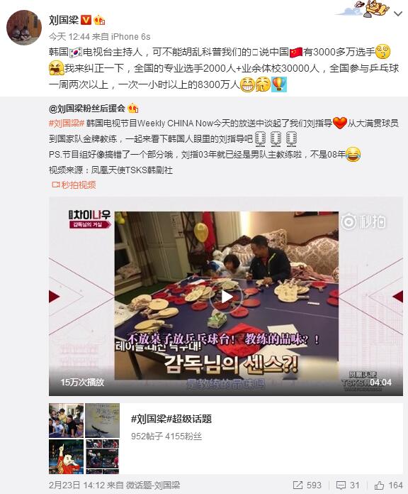 刘国梁转发了有关韩媒报道他的微博,并纠正说:“韩国电视台主持人,可不能胡乱科普说我们中国有3000多万选手。我来纠正一下,全国的专业选手2000人+业余体校30000人,全国参与乒乓球一周两次以上,一次一小时以上的8300万人。”